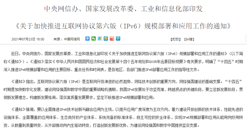 近日,中央網(wǎng)信辦、國家發(fā)展改革委、工業(yè)和信息化部印發(fā)《關(guān)于加快推進互聯(lián)網(wǎng)協(xié)議第六版(IPv6)規(guī)模部署和應(yīng)用工作的通知》(以下簡稱《通知》)。《通知》落實《中華人民共和國國民經(jīng)濟和社會發(fā)展第十四個五年規(guī)劃和2035年遠景目標綱要》有關(guān)要求,明確了“十四五”時期深入推進IPv6規(guī)模部署和應(yīng)用的主要目標、重點任務(wù)和時間表,是各地區(qū)、各部門推進IPv6部署應(yīng)用工作的指導(dǎo)性文件。《通知》指出,互聯(lián)網(wǎng)協(xié)議第...