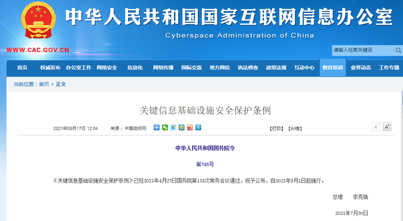 中華人民共和國國務(wù)院令第745號《關(guān)鍵信息基礎(chǔ)設(shè)施安全保護條例》已經(jīng)2021年4月27日國務(wù)院第133次常務(wù)會議通過,現(xiàn)予公布,自2021年9月1日起施行。總理 李克強2021年7月30日關(guān)鍵信息基礎(chǔ)設(shè)施安全保護條例第一章 總 則第一條 為了保障關(guān)鍵信息基礎(chǔ)設(shè)施安全,維護網(wǎng)絡(luò)安全,根據(jù)《中華人民共和國網(wǎng)絡(luò)安全法》,制定本條例。第二條 本條例所稱關(guān)鍵信息基礎(chǔ)設(shè)施,是指公共通信和信息服務(wù)、能源、交...